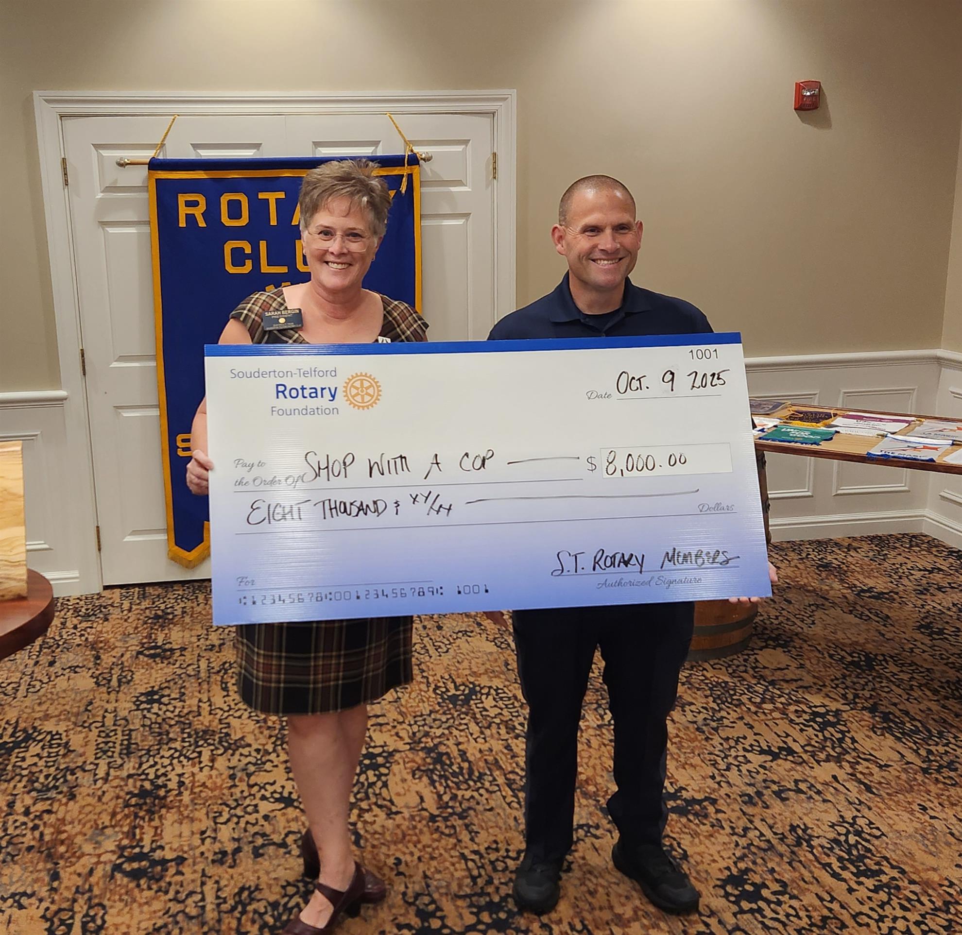 We recently presented Officer Tim Boyle of the Franconia Police Department with an $8,000 check for the Franconia Township Police Benevolent Association's annual "Shop with a Cop" event held each December. For several years our club has donated towards this event as well as served at the event to support local families in our community. We presented our check early this year to help encourage additional giving towards this amazing community event. CLICK HERE is you would like to help make a donation towards this event. THANK YOU!